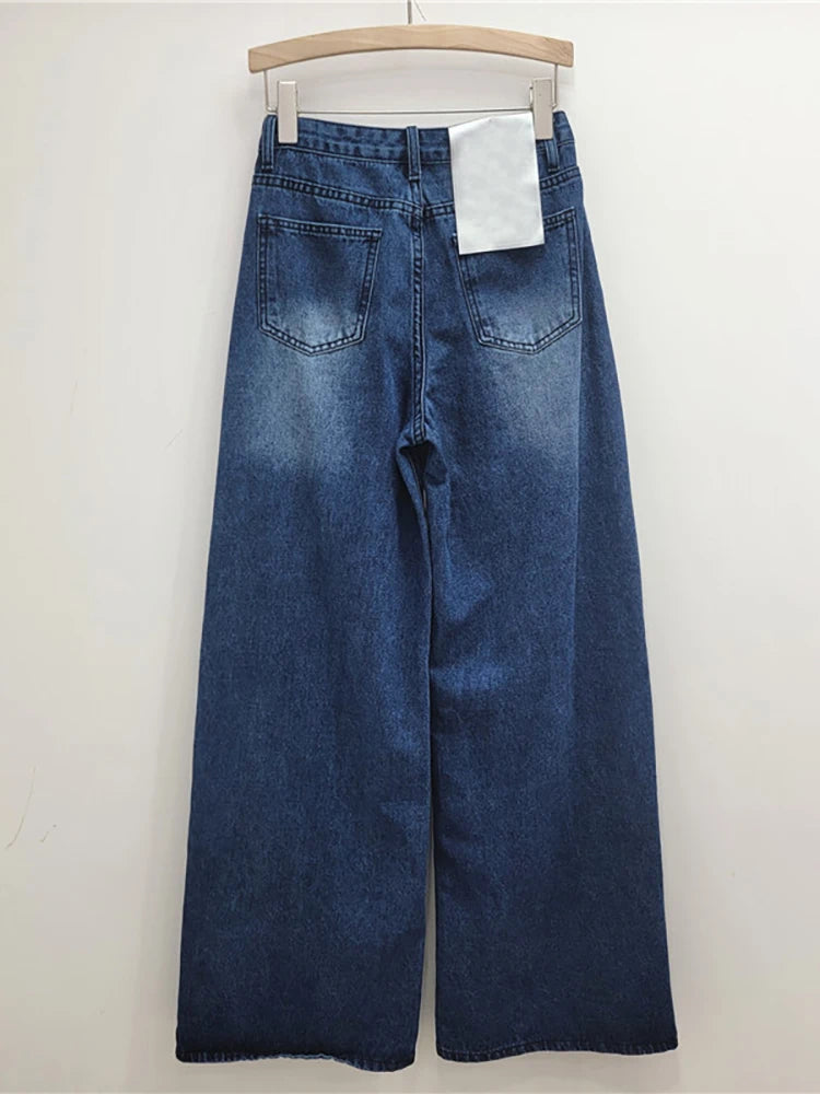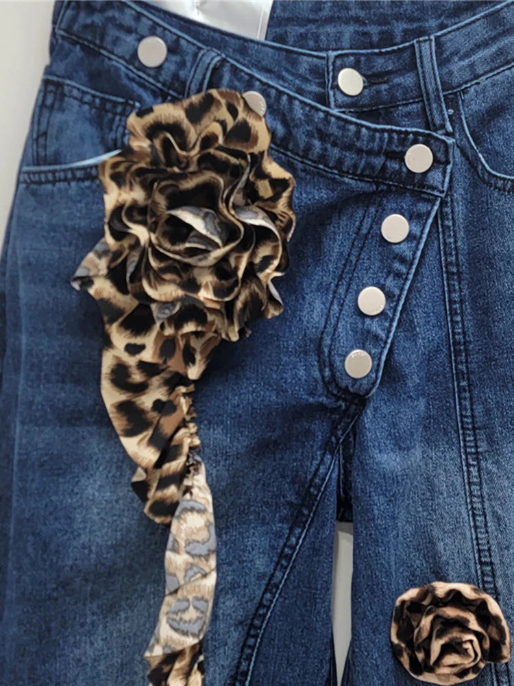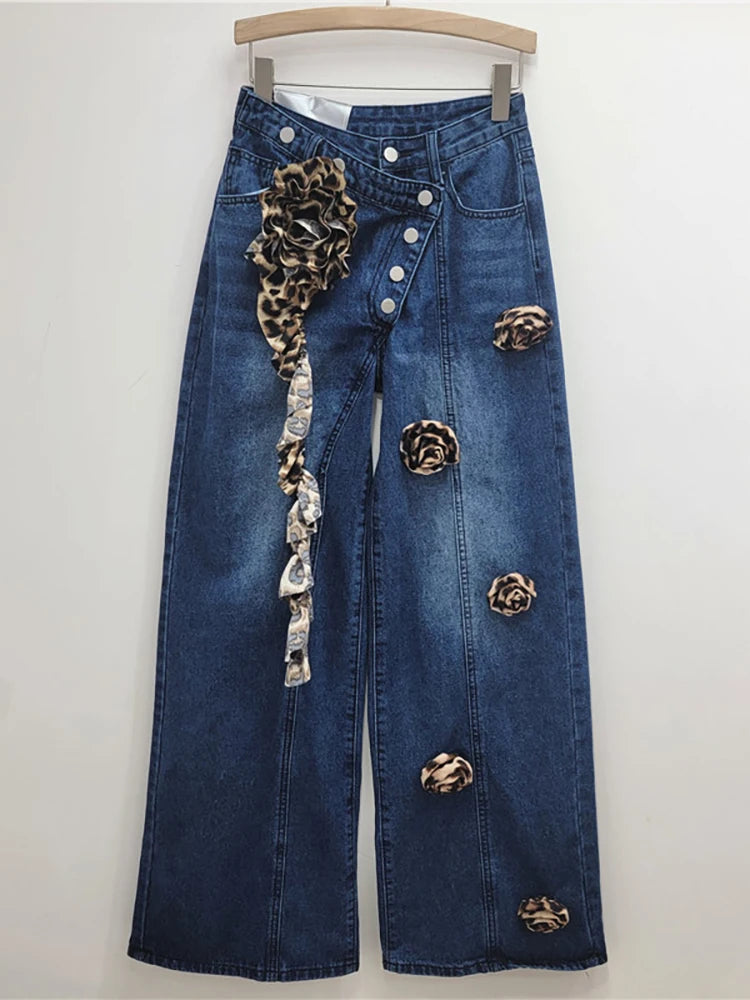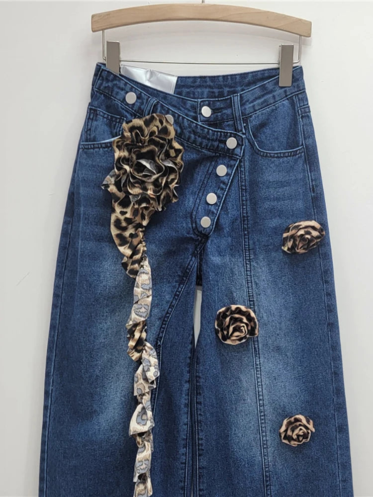 3d Leopard Flowers Diagonal Buttons Wide Leg Denim Pants
