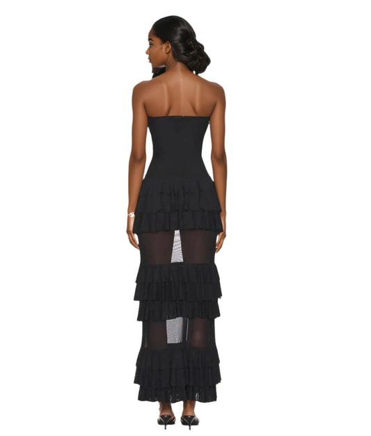 Sheer Tunic Strapless Sleeveless Patchwork Ruffles Fold Midi Dress