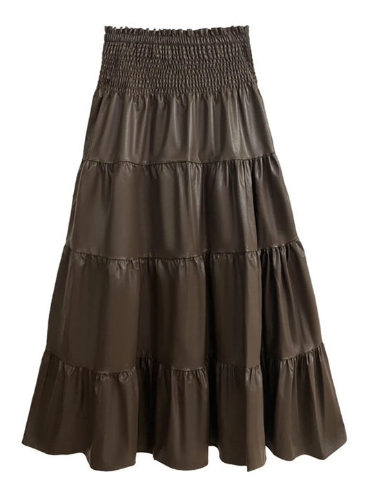 High Elastic Waist Coffee Pu Leather Pleated Long Skirt