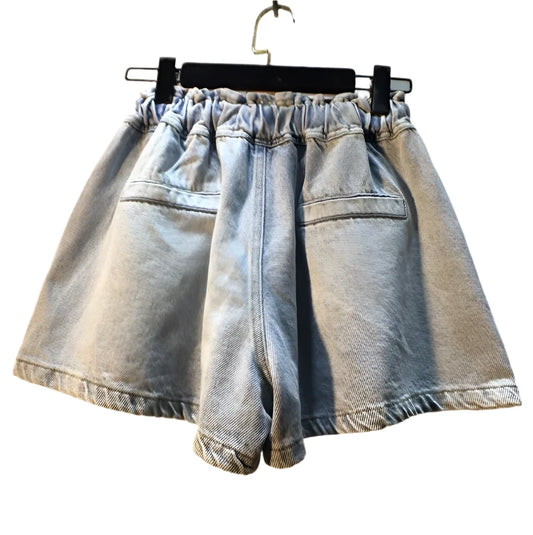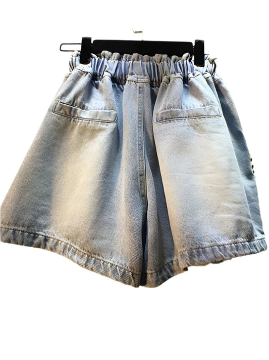 Denim Shorts Rhinestone Drawstring High Waist Wide Leg Short Jeans