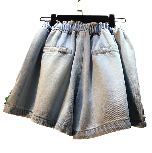 Denim Green Sequins Diamonds Elastic Waist Loose Wide Leg Short Jeans