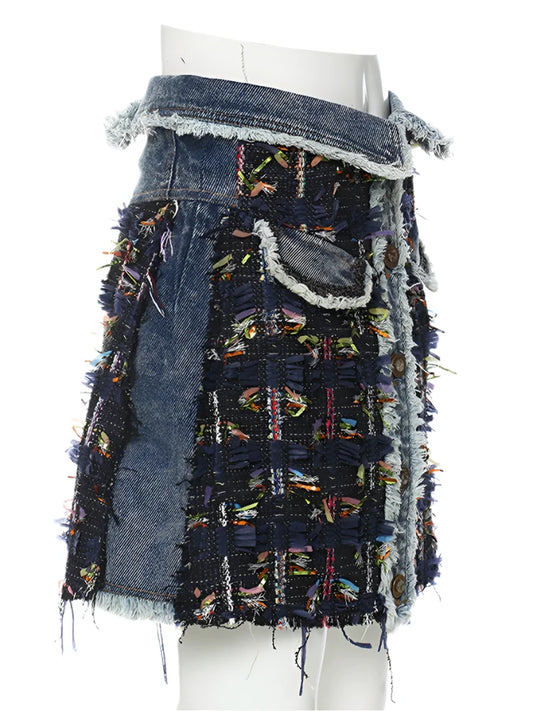 Blue Denim Ribbon Tassels Tweed Mini Skirt