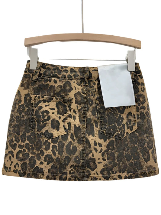 Denim Leopard Printed Pockets A-line Mini Skirts