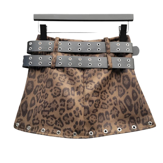 Double Belt Irregular Leopard Printed Brown Mini Skirt