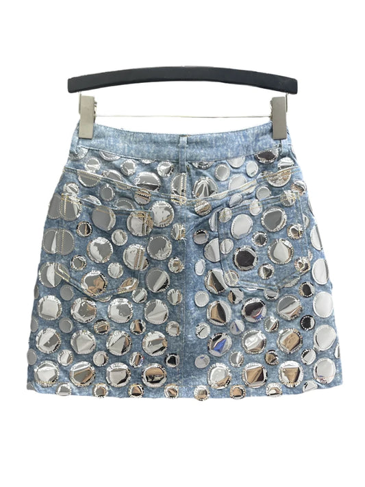 Denim Waist Rivet Colorful Big Sequins Wide Leg Short Jeans