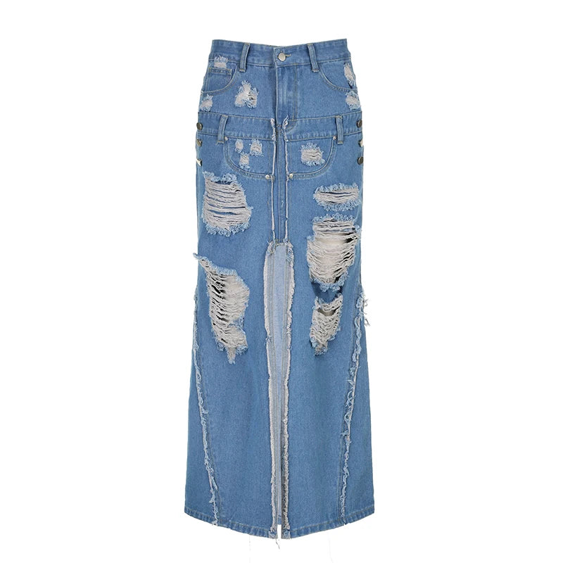 Denim Blue Tassels Pockets Skirt