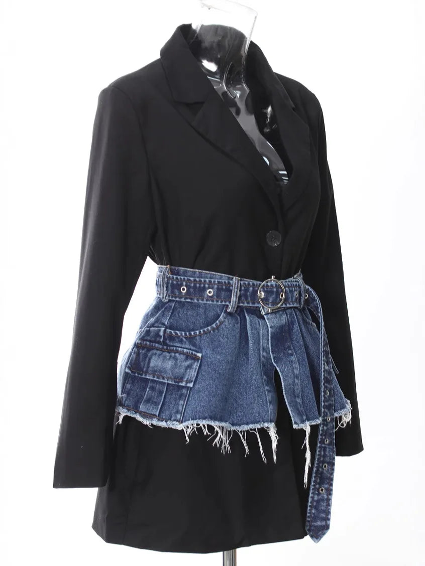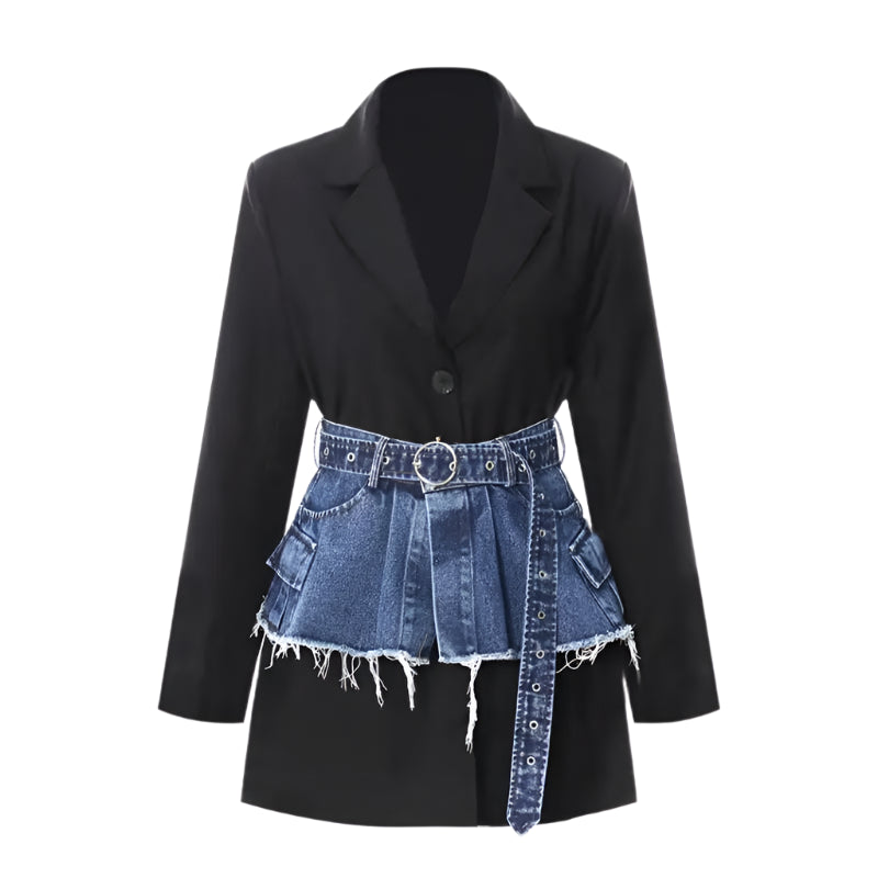 Black Blazer Blue Denim Waistband Overlay Skirt