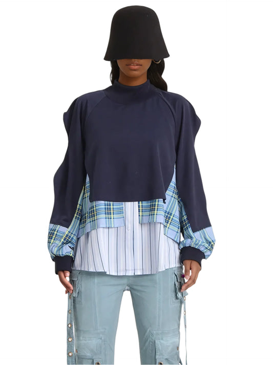 Patchwork Button Round Neck Long Sleeve Sweatshirt