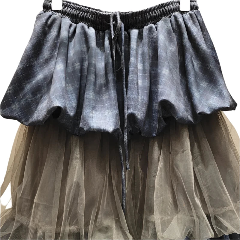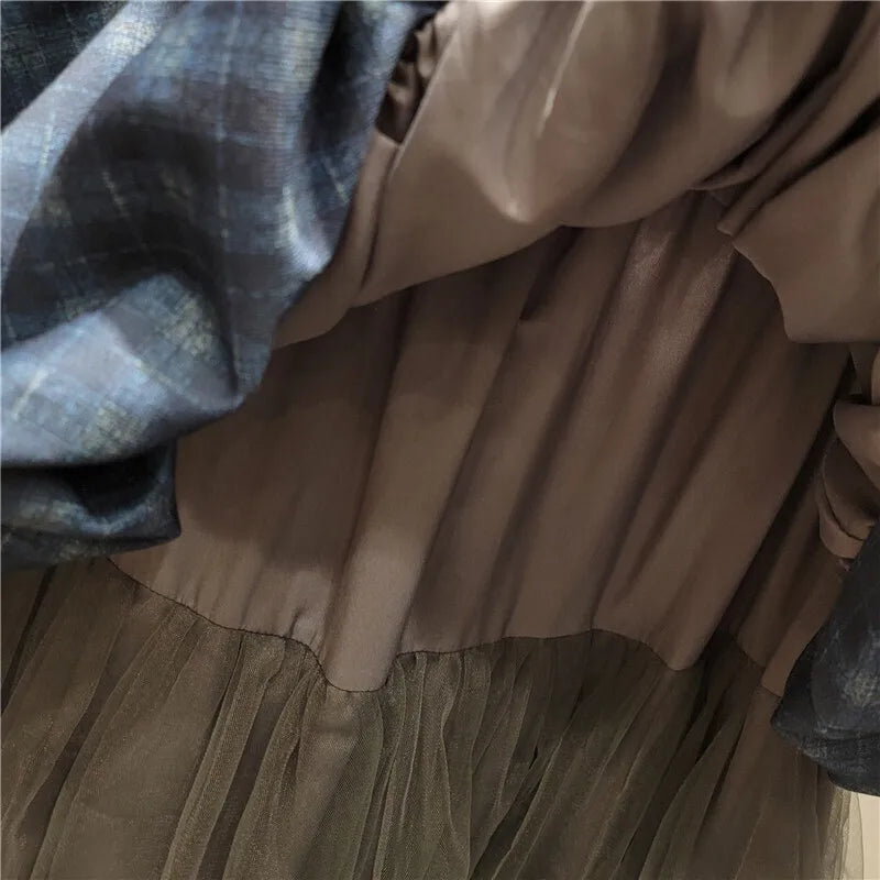 Elastic Waist Blue Plaid Patchwork Mesh Multi Layered Cake Skirt
