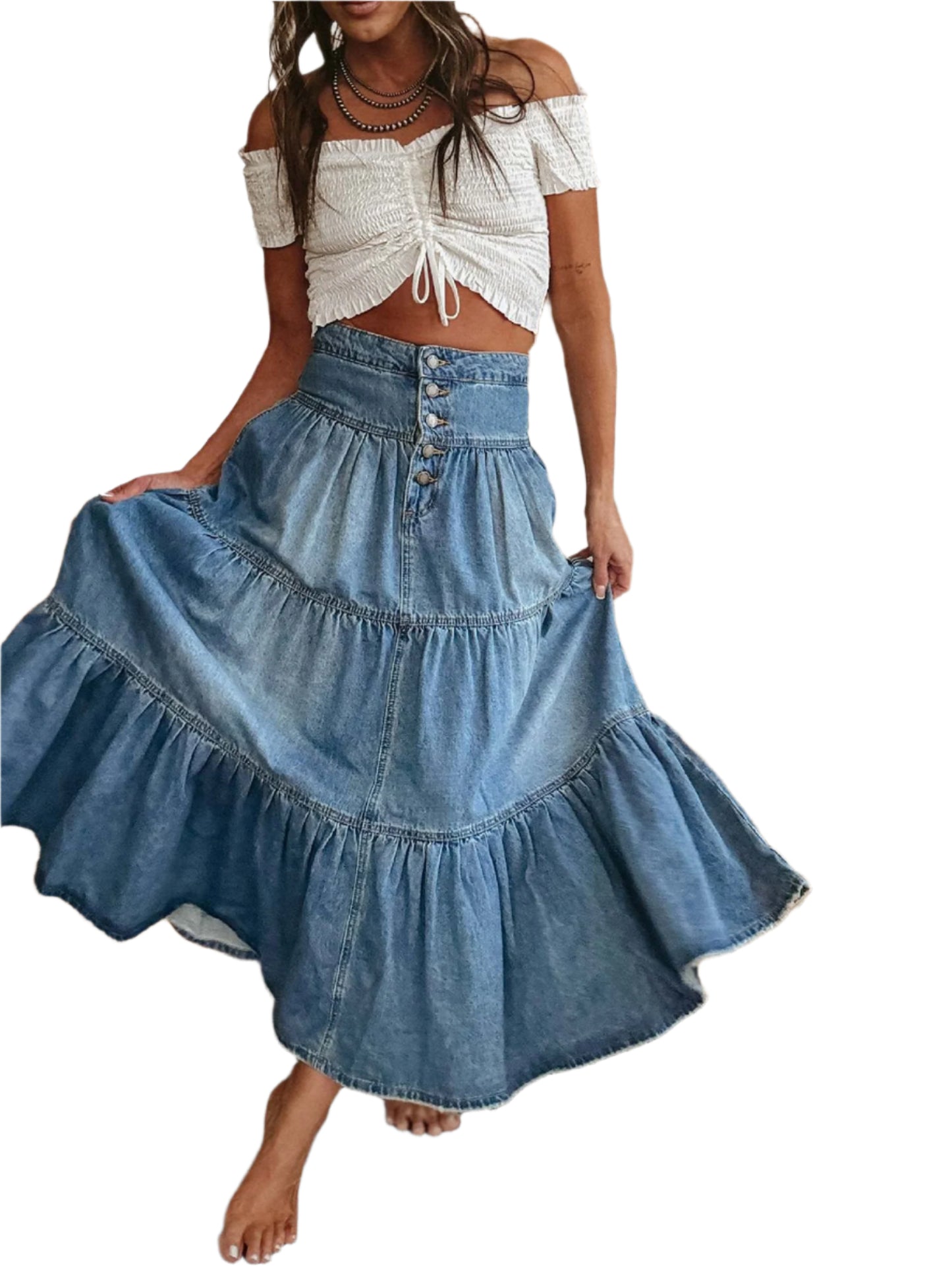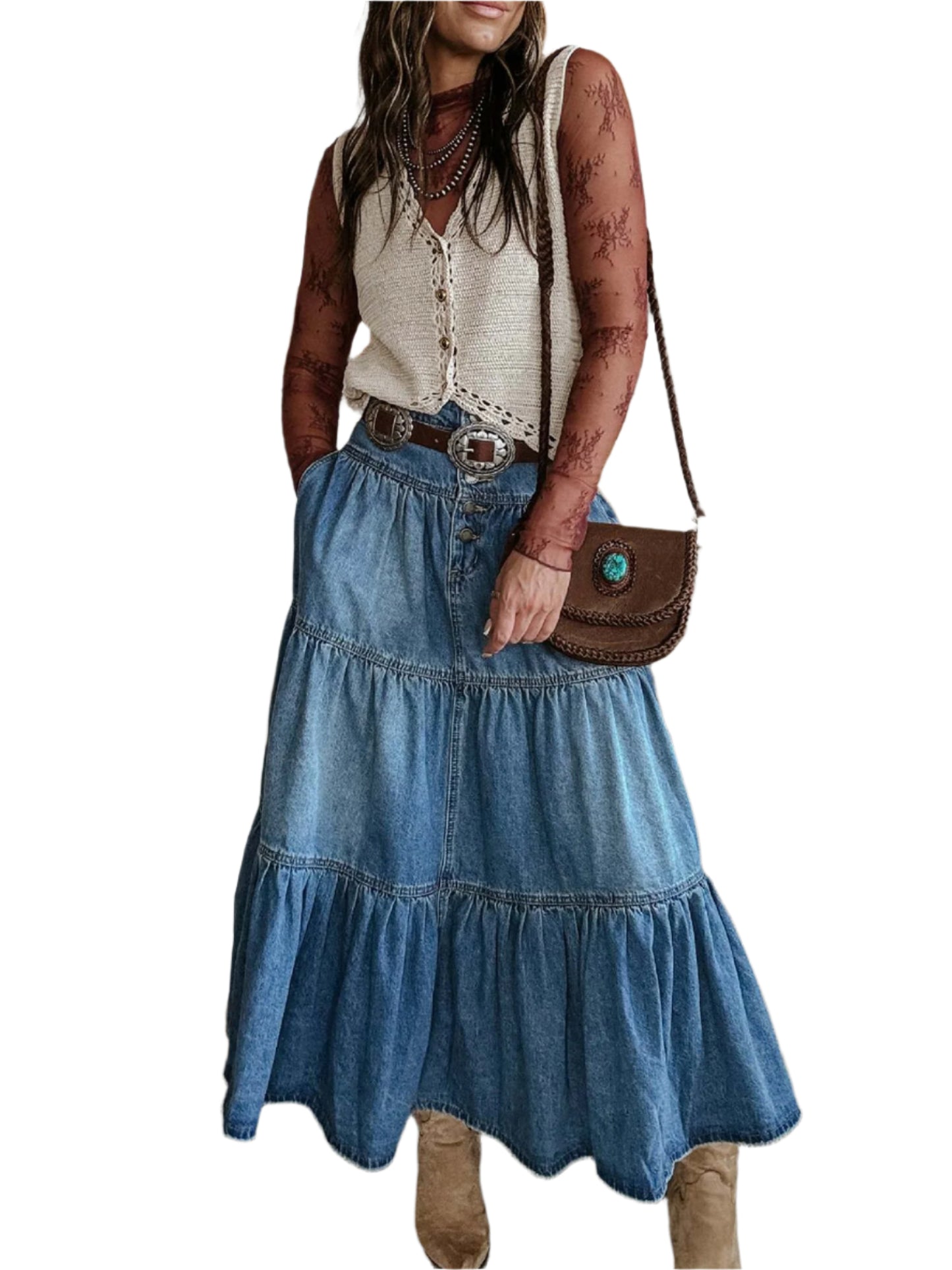High-Waisted A-Line Denim Ruffled Hem Skirt