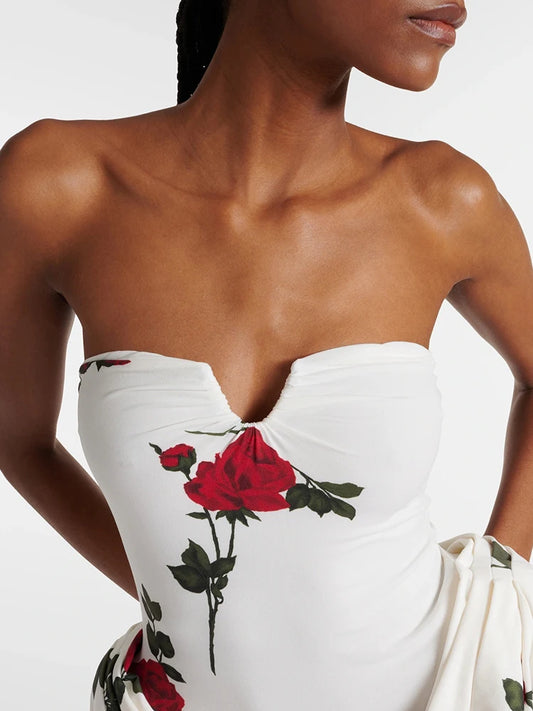 Strapless Sleeveless Draped Floral Mini A Line Dress