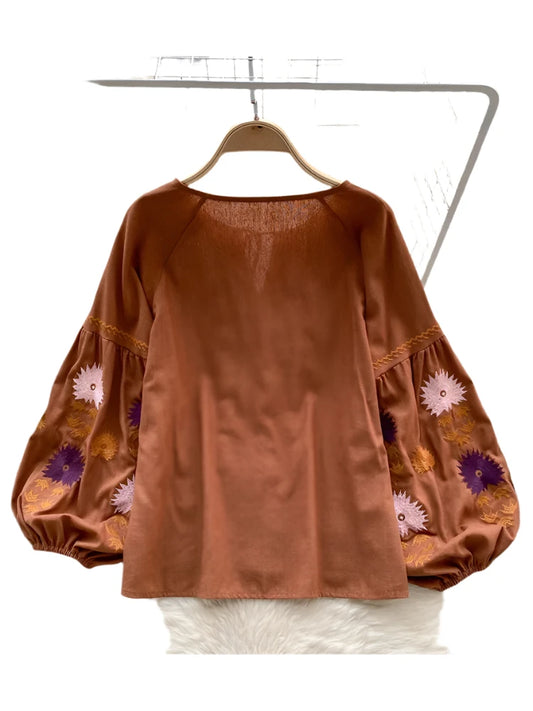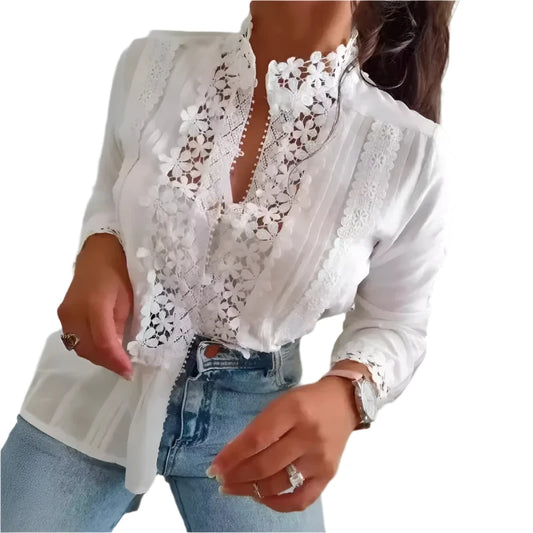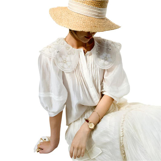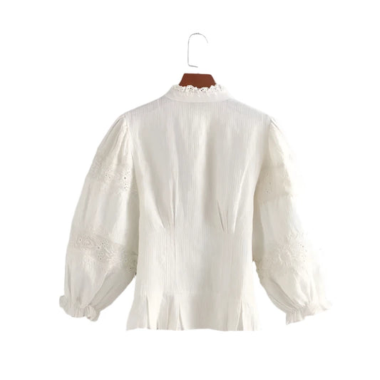 White Lace Cotton Floral Embroidery Puff Sleeve Blouse