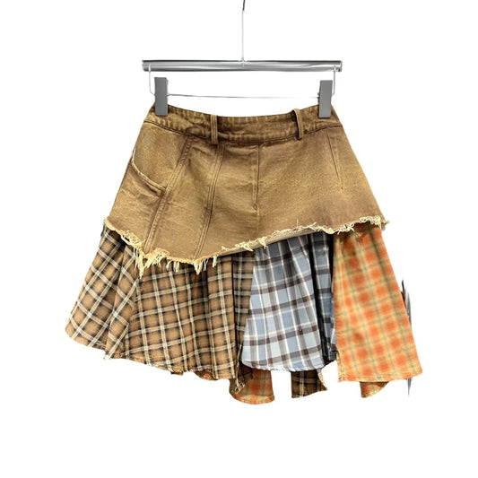 Denim Asymmetrical Patchwork Plaid Mini Skirt