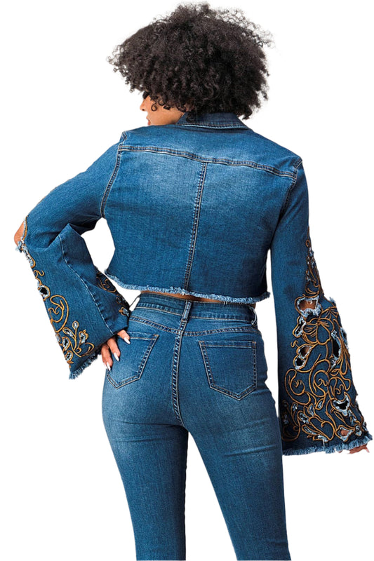 Denim Cropped Jacket Embroidered Bell Sleeve