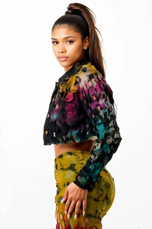 Tie Dye Cropped Denim Jacket with Coin Hole
