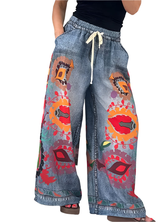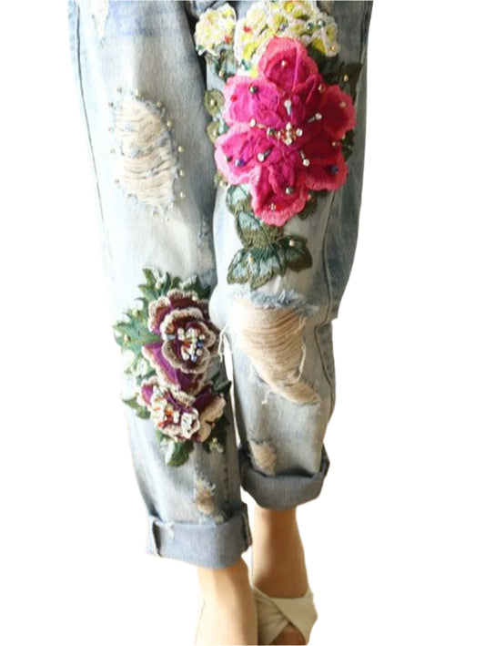 Floral Embroidery Pocket Denim Harem Pants