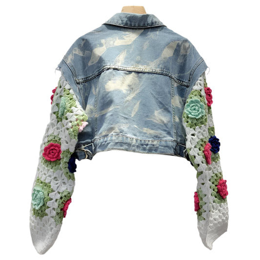 Denim Patchwork Knitted Flowers Sleeve Pocket Short Jacket