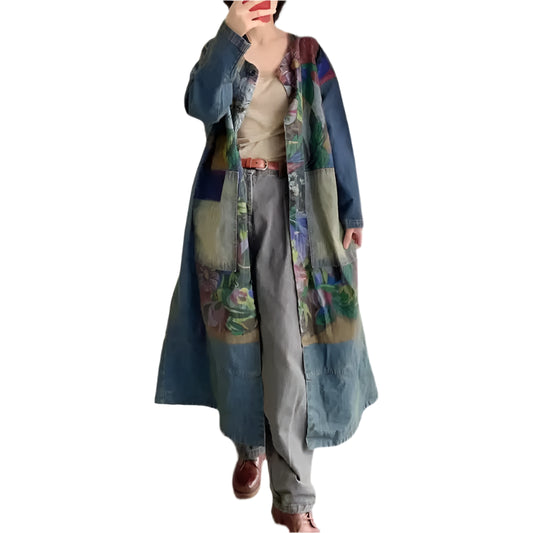 Long Sleeve Single Buttoned Loose Trench Print Long Coat