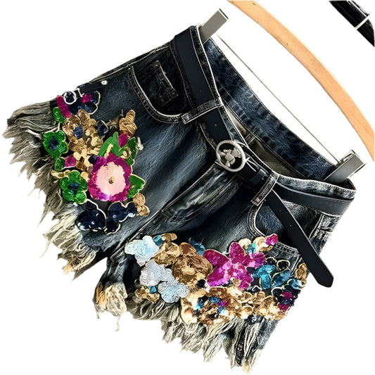 Sequin Floral Print Denim Shorts