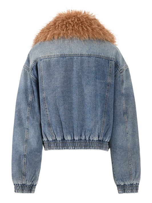 Faux Fur Collar Denim Double Zipper Long Sleeve Thick Warm Short Coat