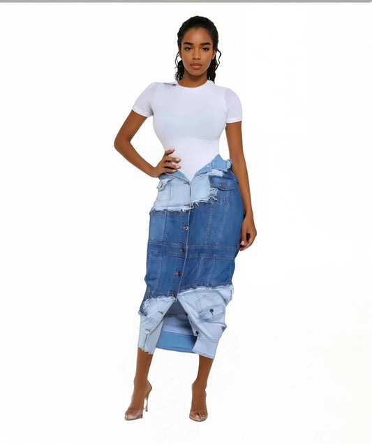Multi Button Design Denim Patchwork High Waist Single Breasted Skirt