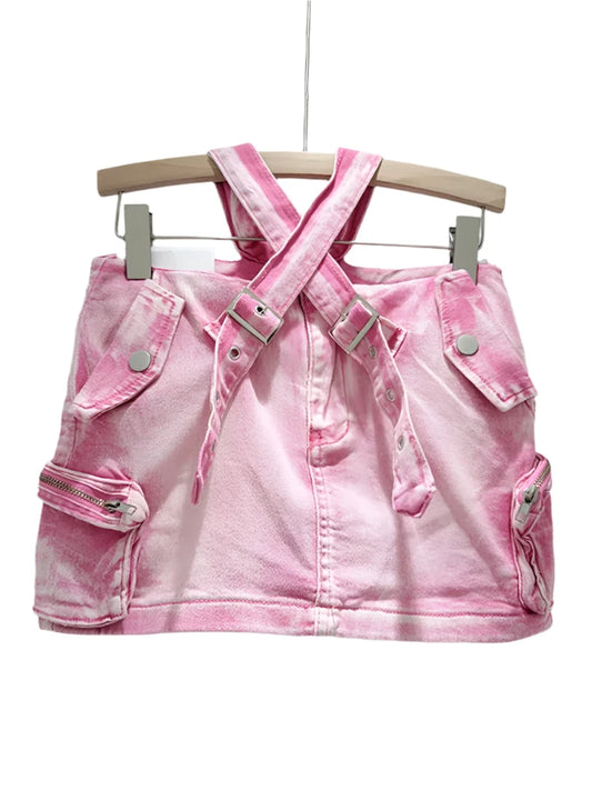 Denim Cross Belt Waist Stretch Cargo Mini Skirt
