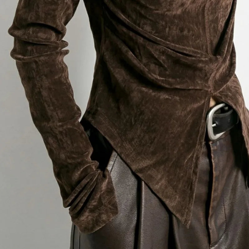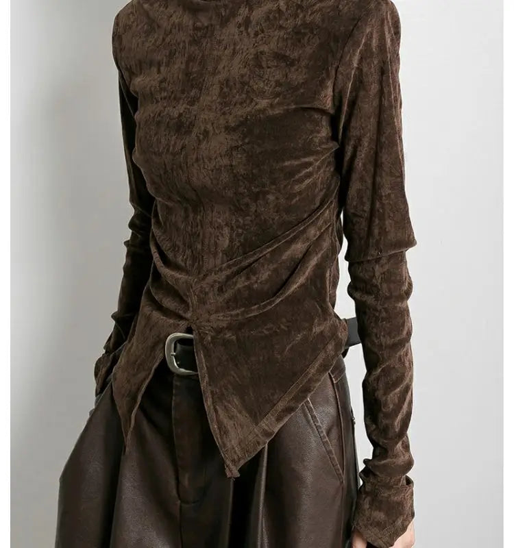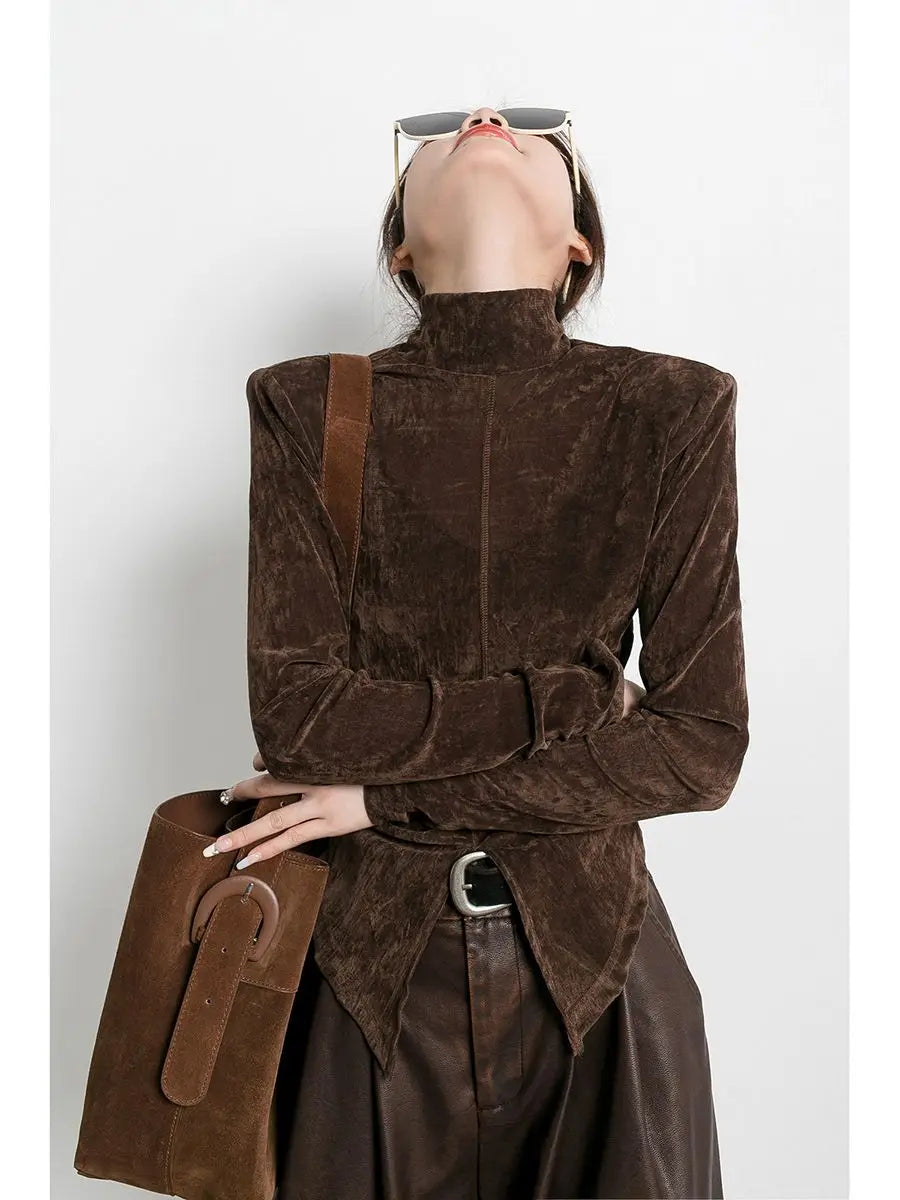 Turtleneck Front Side-slit Long Sleeve Blouse