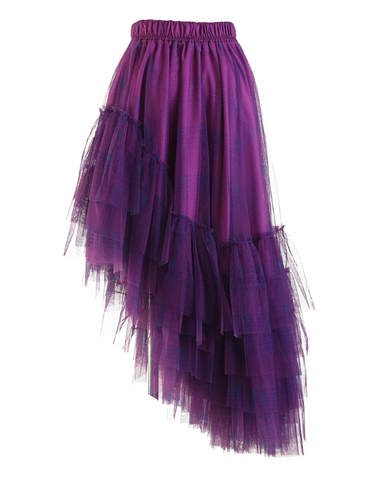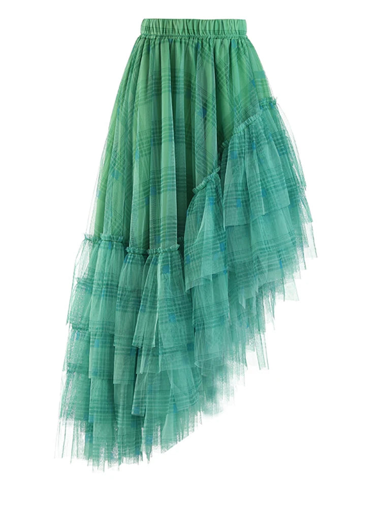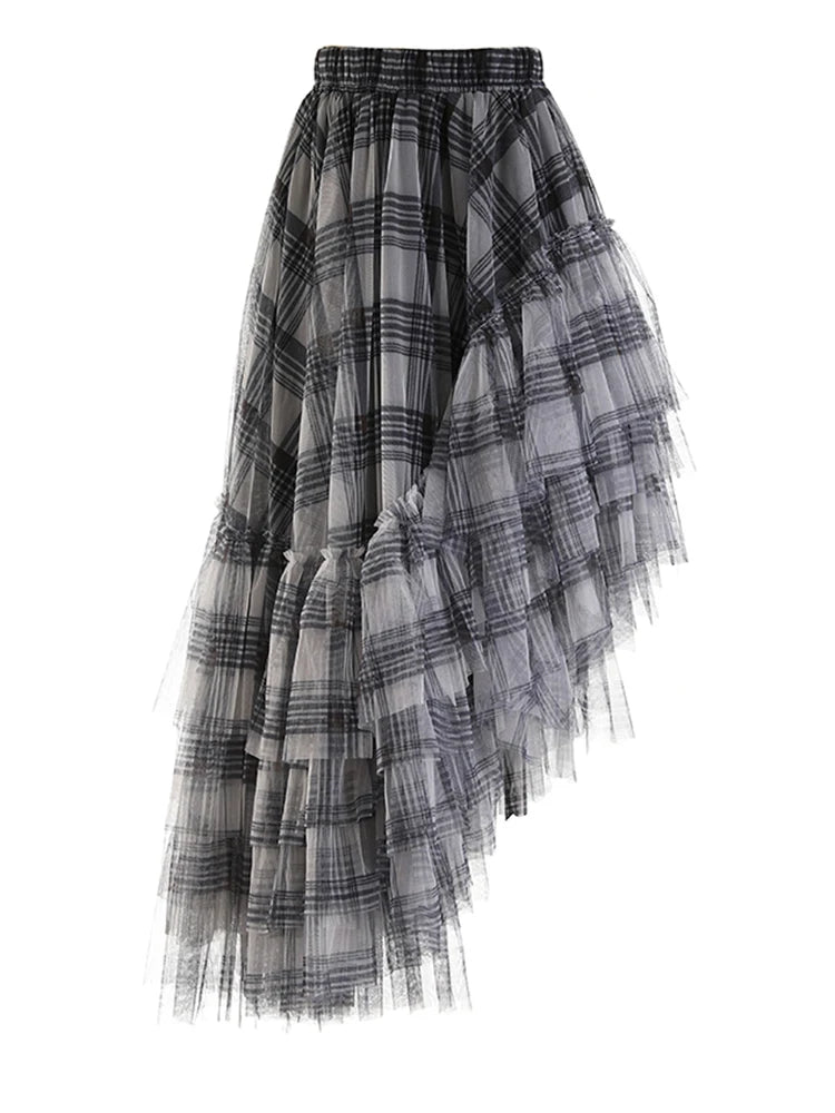 Elastic Waist Red Plaid Mesh Irregular Long Casual Half-body Skirt